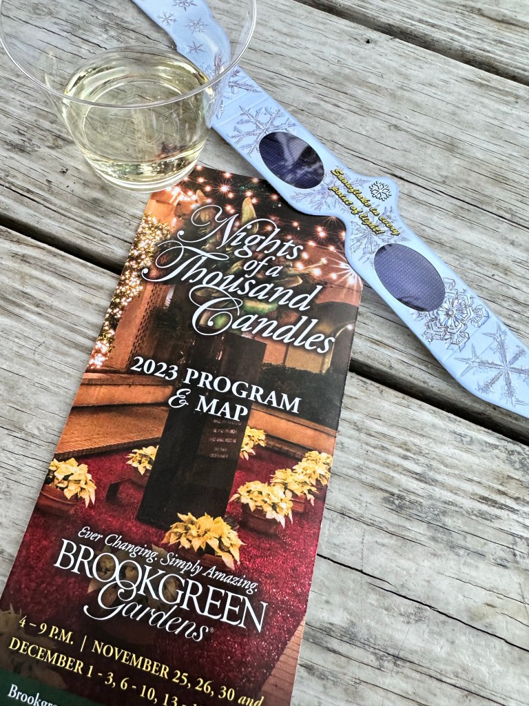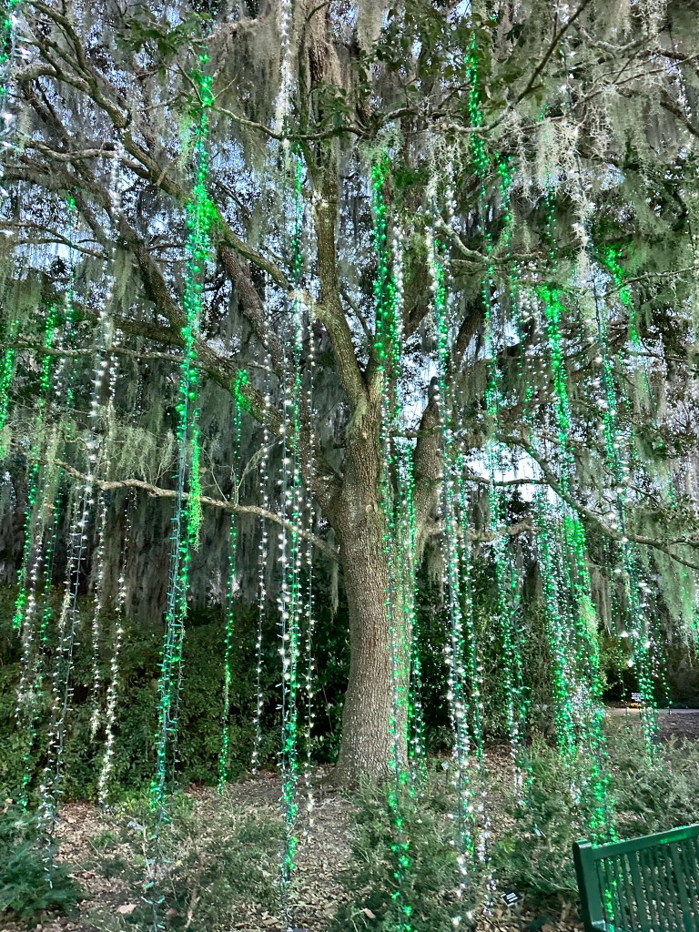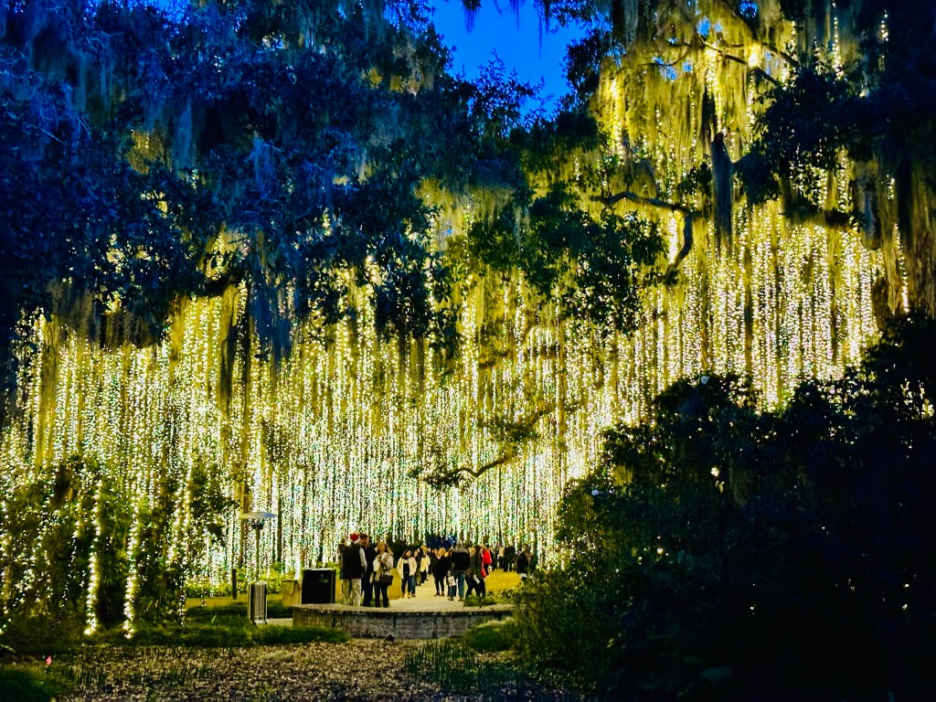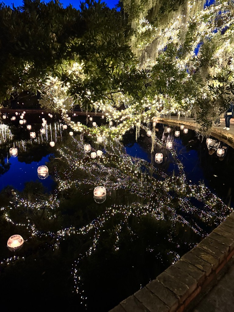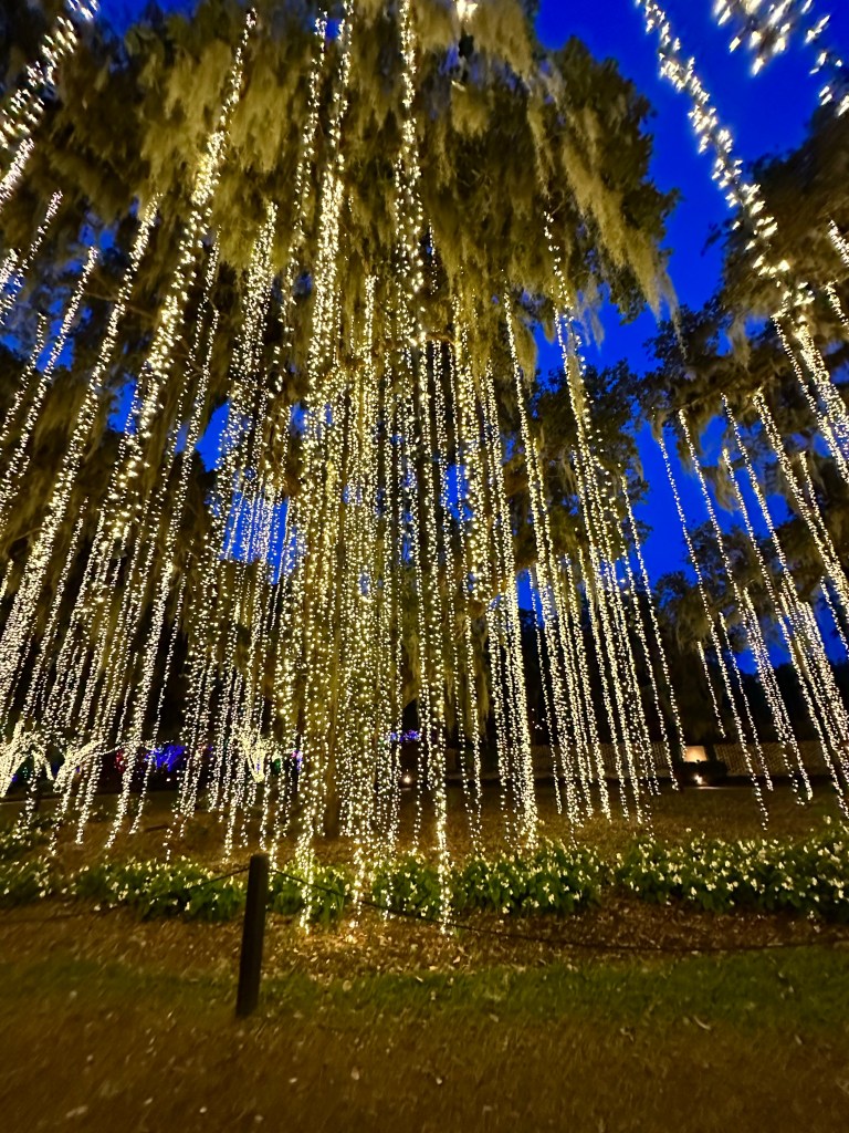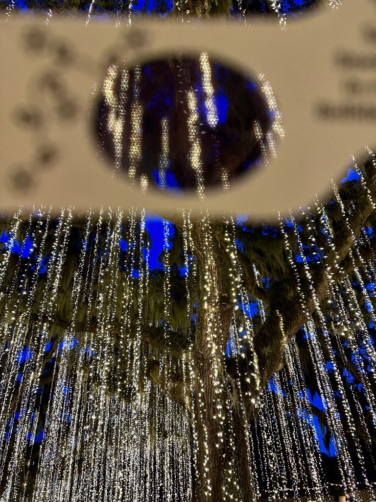 Brookgreen Gardens in Murrell’s Inlet, South Carolina hosts an enchanting light display-Nights of a Thousand Candles. We bought tickets for the Sparkle and Fun package several weeks ago after a recommendation from a couple who said it’s a “can’t miss event”. We couldn’t agree more! The Sparkle and Fun package includes a glass of “champagne” and a pair of glasses which create magical snowflake patterns around the lights.