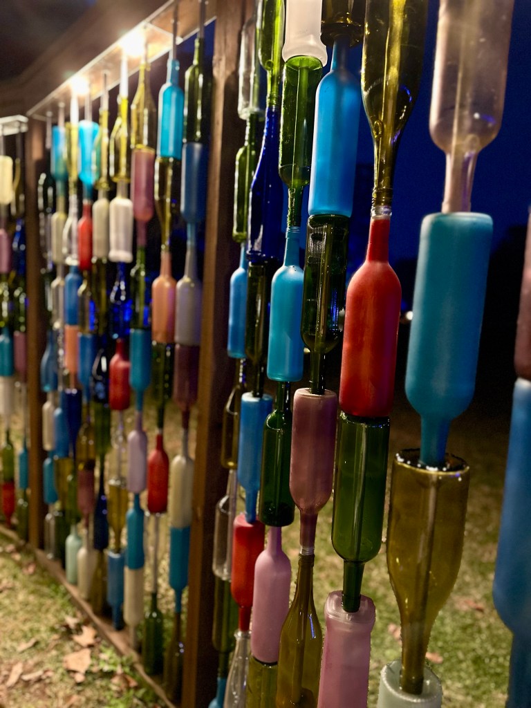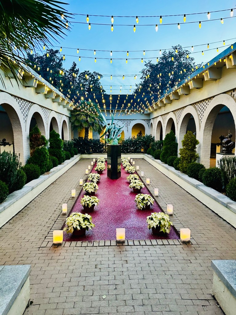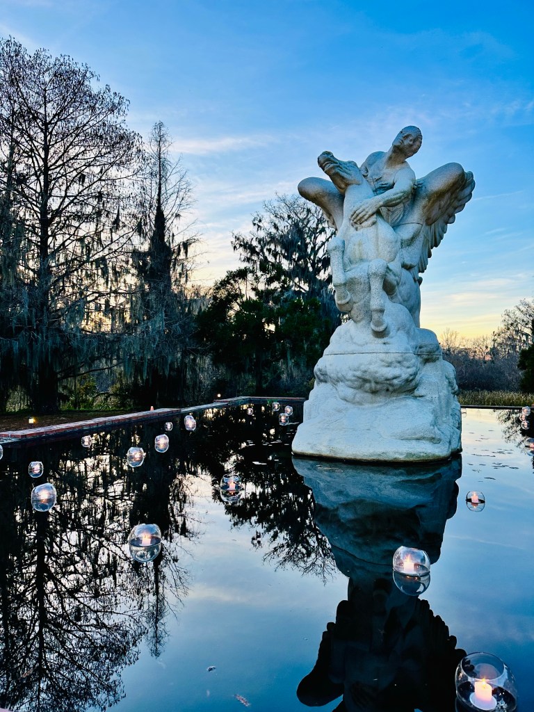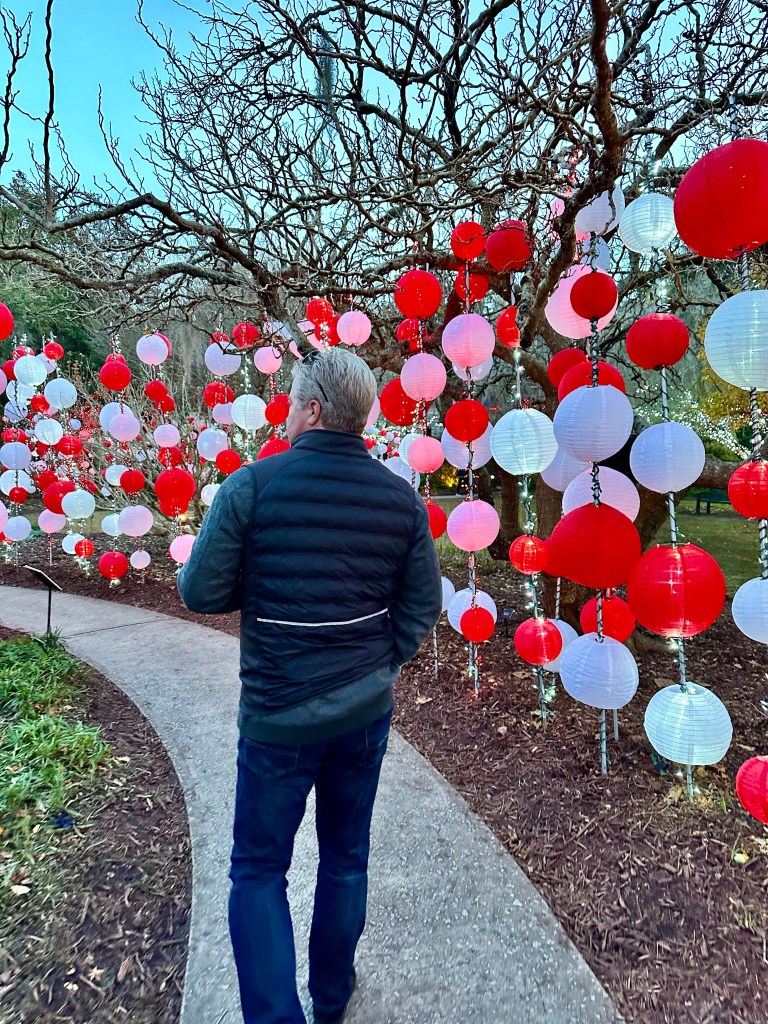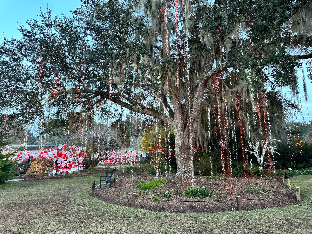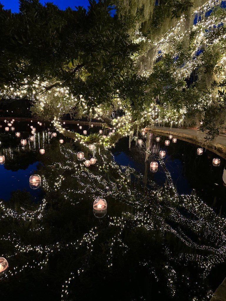 Brookgreen Gardens in Murrell’s Inlet, South Carolina hosts an enchanting light display-Nights of a Thousand Candles. We bought tickets for the Sparkle and Fun package several weeks ago after a recommendation from a couple who said it’s a “can’t miss event”. We couldn’t agree more! The Sparkle and Fun package includes a glass of “champagne” and a pair of glasses which create magical snowflake patterns around the lights.