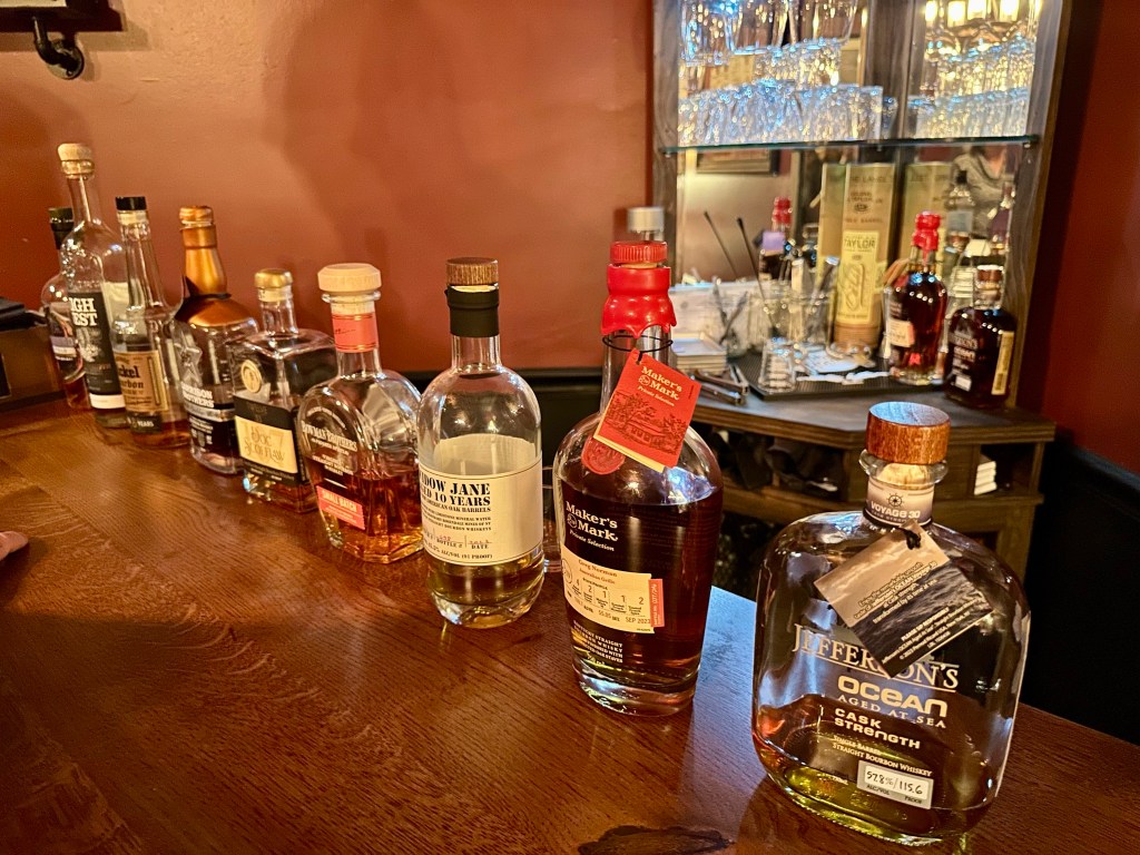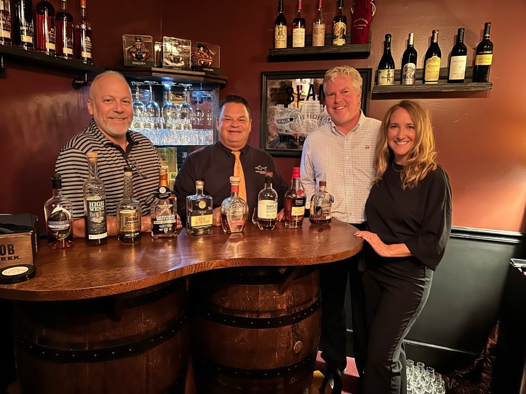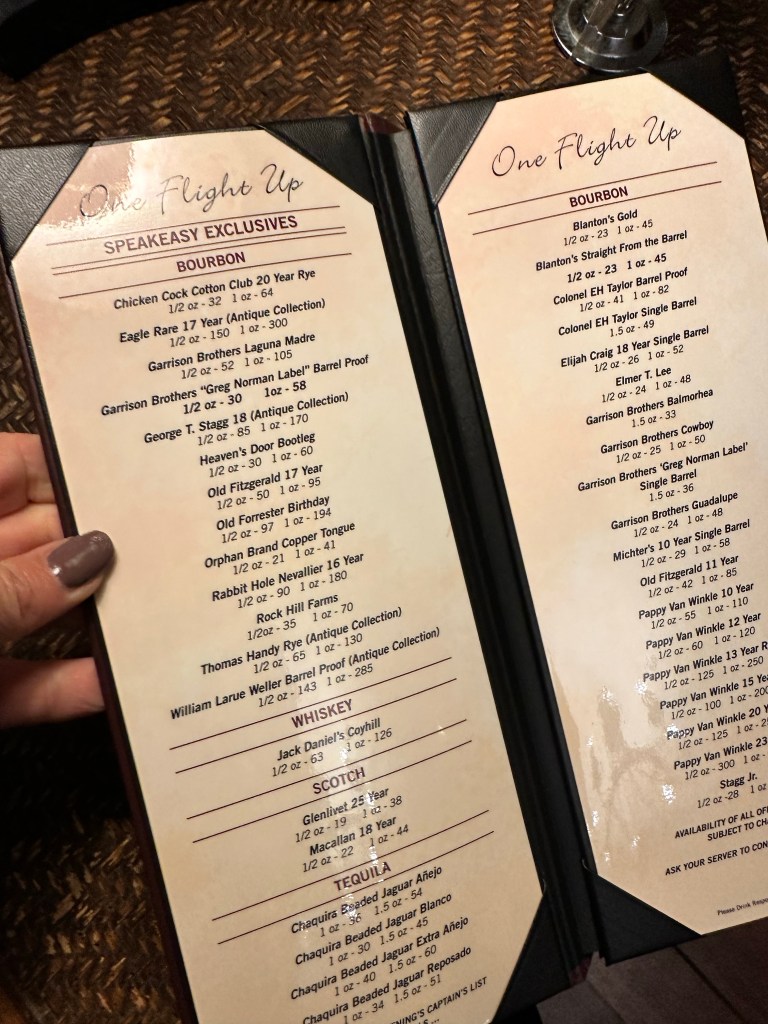 “The Best Bourbons Not from Kentucky” was more than just a theme; it was an outstanding bourbon tasting event that we treated ourselves to at the exclusive One Flight Up Speakeasy, nestled within the Greg Norman Australian Grille at Barefoot Landing. This hidden gem takes tremendous pride in its premier bourbon offerings and boasts a bourbon menu with over 130 selections, including the complete collection of Pappy Van Winkle!